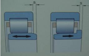 滚动轴承在港口大型起重设备中应用Z为广泛。例如,上海振华港机公司生产的岸边集装箱起重机的滑轮多数都采用422XX系列的圆柱滚子轴承(图1中B2所示)。货物的起吊都是通过钢丝绳受力进行动作的。钢丝绳必须通过滑轮进行力的变向与分配,而轴承正是承载滑轮运行的主要部件。起升机构的滑轮轴承主要是承受径向、重负荷,用于高转速。422XX系列的轴承为内圈单挡边圆柱滚子轴承,其挡边结合滚子的特殊设计和表面处理,能产生良好的润滑效果和减少摩擦,其中一个带挡边的套圈是与滚子和保持架组件连在一起的,可与另一个套圈分离,可以在一个方向作轴向定位,因此也便于安装和拆卸。此类轴承可以允许因热膨胀造成轴与轴承座之间有一定的轴向位移(图2所示)。由于轴向位移是在轴承内发生,而不是产生在内圈与轴或外圈与轴承座之间,因此当轴承在转动时,摩擦并无明显增加,可有效降低轴承的运行温度,适合像起升机构类似的高速动作。值得注意的是,在一些较早生产的港口起重设备的配置中,其滑轮并无端盖的设置,这就使污染物、湿气等极易进入轴承内部,影响轴承的使用寿命。所有遇到这种情况时,可以选择带有密封圈或防尘盖的轴承。