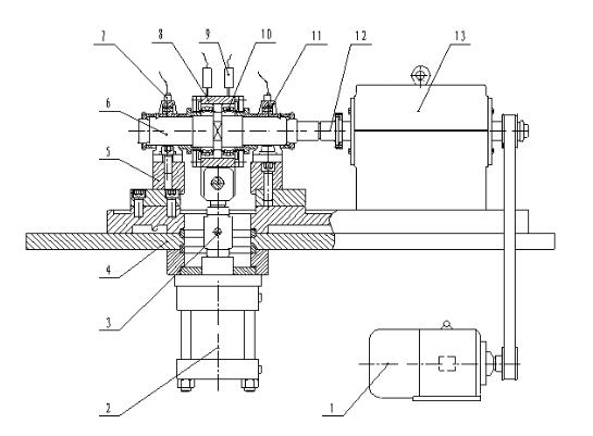 1.变频电机;2.液压缸;3.力传感器;4.工作台面;5.调节垫块;6.主轴;7.振动传感器(两套);8.承载套;9.温度传感器(四套);10.加载轴承;11.带座外球面轴承;12.联轴节;13.传动装置