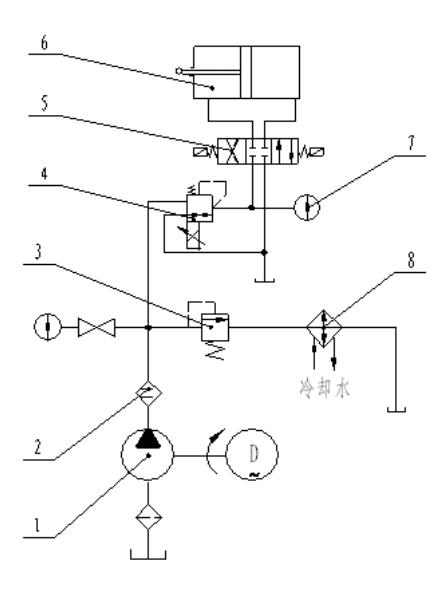 1.油泵;2.过滤器;3.溢流阀;4.比例阀;5.电磁换向阀;6.加载油缸;7.压力表;8.冷却器