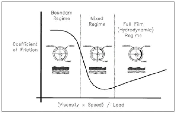 在阶段,轴和轴承直接接触,导致了产生高摩擦量。在这段曲线,轴承的高自润滑性非常有用。随着轴速的提高,我们转到此曲线的第二阶段(混合膜),在此阶段,流体动力膜开始建立,并有效地把轴从轴承的表面提起,这将减少轴与轴承的接触,并很快地减少摩擦。速度继续增长,我们转入第三阶段(流体动压)阶段,在此阶段,流体动压膜已建立,足以消除所有直接的接触。随着速度的继续增长,摩擦开始增加,这是因为润滑剂的粘度增加了剪切阻抗力。