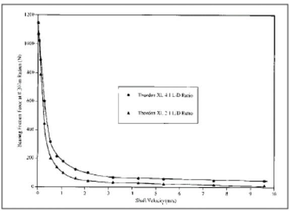 由于认识到了本文前面提到的关于船舶推进器尾轴轴承原理的优越性,所以,研究人员开始了一个研究项目。研究人员基于无槽轴承和有槽轴承之间优越性的计算比较,它们选择一个种下平上凹的结构。这平直的下半部分加强了流体动压膜的优化建立。同时,成凹型的上半部分让轴承流过足够的水,以维持流体动压膜和冷却降温。下一个需观测的变量是轴承的长度。由于弹性聚合物轴承与其它材料的轴承相比,具有十分高的承载能力。研究人员曾经做过长径比分别为4:1和2:1的Thordon XL弹性聚合物轴承运转比较试验。在两类轴承上都加以同样的载荷,按长径比4:1设计的轴承其所受的压力为0.24MPa,而长径比为2:1的则为0.48MPa,如图3所示,按长径比2:1设计的轴承摩擦明显的减少。这两类轴承除了在摩擦方面,其它运转特性都相同。在长径比为4:1的轴承的前半部分,由于对水的额外剪切作用,而致使长径比为2:1的轴承摩擦减少。