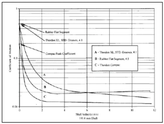 研究人员现以开发出了一种具有高自润滑性的新型弹性聚合物,也对Thordon XL轴承和平面型橡胶轴承在长径比为4:1和2:1情况下,进行了比较试验,这种新的弹性聚合物在长径比为2:1的结构中被称作Thordon COMPAC系统。这种COMPAC系统试验在图4中展现了曲线怎么移动,阐明了轴承在干摩擦和边界润滑阶段,工作时间的减少以及在液体动压运转时,摩擦水平的降低。静摩擦力矩和工作时的摩擦也都随之减少。轴承也转变成了平滑运转,磨损减少,工作效率提高,现以成功使用的艉管式轴承其工作性能取决于液体动压膜的早期开发研究,该能力将会受到许多因素的影响,包括轴承受到的单位载荷轴承的结构以及轴的线速度。