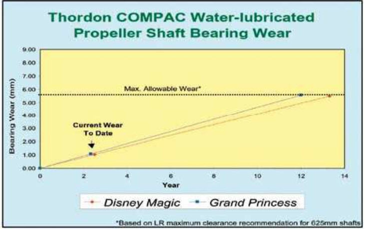 图5、轴承磨损测量取自Grand Princess 和Ddisney Magic号游轮。两个装有橡胶聚合物水含硼润滑轴承。