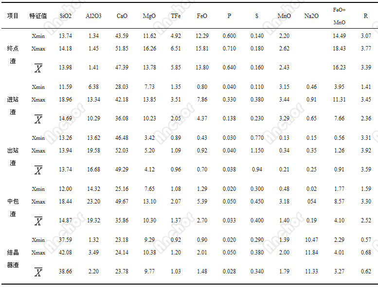 1.转炉终点渣;2.进LF站渣;3.出LF站渣;4.中包渣;5.结晶器渣;