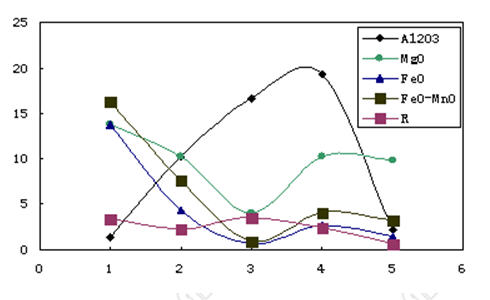 将表6中的Al2O3、MgO、FeO、FeO+ MnO、R作图,如图1所示: