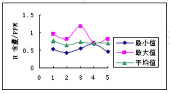 4.2.2从图3中可知,H的变化不大,但由于试样存放时间长,成分检测结果偏低,但从变化趋势来看,H也有增加的趋势,应对耐火材料、辅料中的水分予以关注。