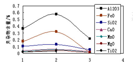 ②由于在结晶器内全氧量呈下降趋势,这说明钢水在中间包内夹杂物得到去除上浮;
