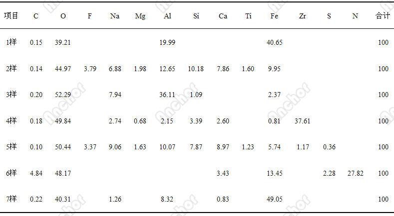 ③ 结晶器及中包水口被侵蚀而进入钢液。扫描分析中有元素Zr,重量百分比Z多达到37.61%,有与中包水口相关的Ti元素存在,重量百分比Z多为1.60%,以及在不含F元素时,仍有Na元素存在,这表明结晶器及中间包水口被侵蚀(钢水及保护渣作用),进入钢液形成大型夹杂;