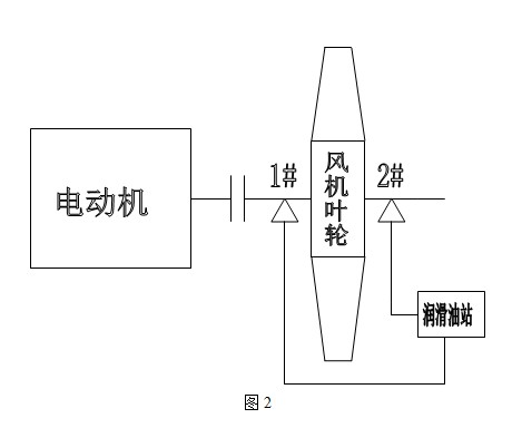 我公司主风机结构示意图如图1所示。1#、2#轴承润滑冷却通过往轴承座加润滑油得力士46。出于对设备安全考虑,我们设定轴承温度80℃报警,到95℃主风机自动停止来保护设备。每年一到夏季,随着气温升高,主风机轴承温度不断升高,经常温度达到95℃主风机跳停,严重影响生产。于是我们把润滑油换成粘稠度比较高的得力士68,效果不明显。随后又换成粘稠度更高的F320但还是时不时跳停。后来我们在1#、2#轴承座处各接一水管,通过水强制冷却方式来降低轴承温度,保证生产的连续性。通过水冷方式虽然控制住轴承温度,但冷缺水流的到处都是,影响现场环境,不符合现场管理要求。