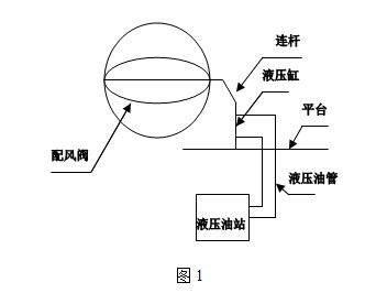 我公司热风管道配风阀简图如图1所示。配风阀通过液压缸伸缩带动连杆使配风阀轴转动来达到配风阀开关的目的。配料开时,中控需要把配风阀关闭来保证热量抽到磨里,停配料时需要把配风阀打开防止热量过去把收尘器滤袋烧破。配风阀开时,热风炉火苗从配风阀冒出来周边温度达到100℃以上,时间一长把液压油缸油封烤坏造成液压系统漏油,中控不能实现对配风阀的开关,影响生产。