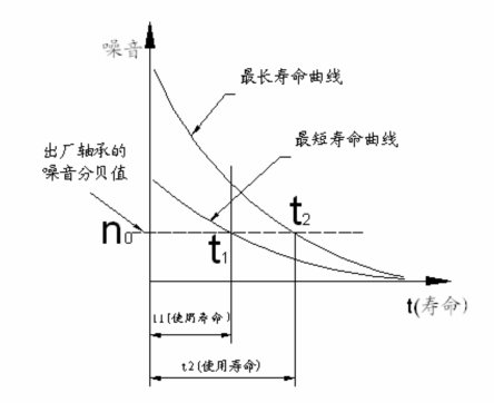 如上图轴承的寿命和噪音曲线所示,出厂时相同噪音分贝值n