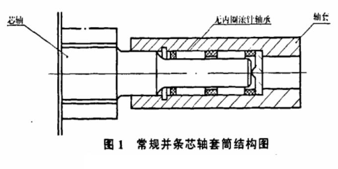 常规并条轴套与芯轴的结构简图如图一,使用中并条芯轴高速旋转,而轴套静止不动,其摩擦情况为滚针与芯轴,滚针与轴承外卷均为滚动摩擦,由于滚针为滚动体,直径小(仅ф2mm),接触面长(达8mm)芯轴旋转一周滚针转动圈数多易发热,接触面长也易发热。这种结构的特点是能承受大压力,不能随高速旋转。以FA311型并条机为例,轴套受到的压力为20-30kg,并条芯轴的转速高达3600转/分(以出条速度400米/分,皮辊直径35计),显然这种结构不适合FA31l等高速并条机,仅能勉强适用于A272F等低速并条机。因而从结构上讲,常规高速并条机轴套发热是必然的,只不过是进口轴承好些,使用优质油脂好些,使用质量稍差的轴承发热严重些。