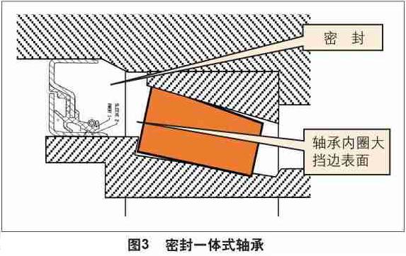 针对不断提高的车辆传动系轴承的使用要求,铁姆肯公司开发出一系列新型轴承,以满足用户在节油、应对更严酷的工况方面的要求。Fuel-Efficient(FE)节油轴承(图2)通过内部几何结构、尺寸优化等特殊设计,不但可减小轴承系统的跨距布置,而且尽可能地降低了轴承内部摩擦转矩,降低工作温度,延长轴承和润滑油的使用寿命。另一高功率密度设计——P900(TM)轴承,则在材料纯净度、滚道特殊修型、表面光洁度等方面进行全面提高和优化,使轴承更能适应车辆传动系统的高载荷、高形变、高温,低转速、低润滑油黏度的严苛工况。在驱动桥主减速器中,主动锥齿轮轴上的前端轴承(非齿轮端)如果采用铁姆肯公司的密封一体式轴承(图3),可减少齿轮轴密封面加工要求、缩小轴长度、减小摩擦转矩和发热量,并具有更好的防杂质与防漏油性能。