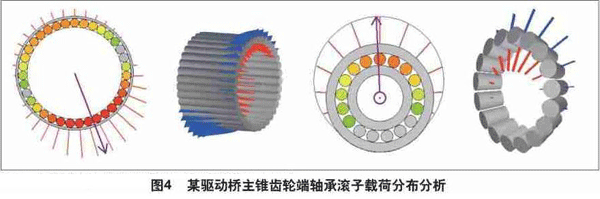 铁姆肯公司的修正寿命L10a概念和轴承全系统分析技术解决了以往寿命修正系数考虑不全面、取值时又没有认识到系数之间的关联性问题,使轴承的寿命计算分析更加精确、更加符合实际情况。该计算理论综合了轴承自身的参数和安装参数,以及轴和轴承座材质等整个系统因素对轴承寿命的影响,不仅全面考虑了实际使用环境因素,而且通过专业的轴承选型分析软件,对整个轴承工作系统进行分析计算,从而使上述寿命修正系数的取值更为准确、合理。全系统分析可按客户需要提供详尽的分析结果,包括为客户自制零部件的设计提供参考。例如,某驱动桥主锥齿轮端轴承滚子载荷分布分析图,详见图4。