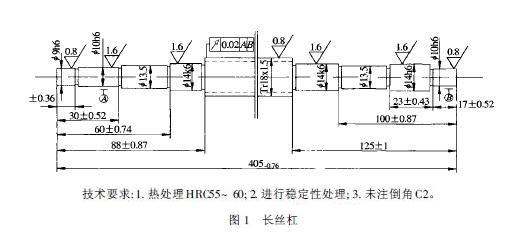 丝杠材料直接影响加工工艺及热处理后工件的机械性能。因此高精度长丝杠的制造中一个很重要的问题就是合理选择材料,通常可从合金工具钢、合金结构钢、碳素工具钢中选择。根据图1所示零件的技术要求,综合热处理工艺性和机加工工艺性,选择65Mn,此材料可获得较高硬度55~60HRC,丝杠具备高强度、高耐磨性。