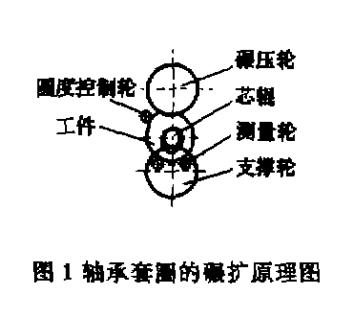 图中由机械手自动将工件毛坯放入碾压轮与芯轴的沟槽中,支撑轮顶住芯辊的两边,碾压轮将旋转运动传递给工件,碾压后的工件形状和宽度由模具保证,其外径与沟道尺寸由测量轮通过计算机控制。