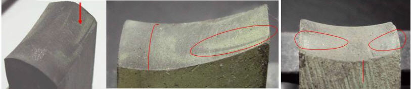 我们从几个典型的使用后的油石实样中也能很明显的看到由于干涉造成的油石表面的塌陷和缺损情况,外圈和内圈分别见图3和图4。在使用过的油石表面总会发现有油石本色(失去了研削痕迹)的区域,应该是因干涉而刮去的部分。