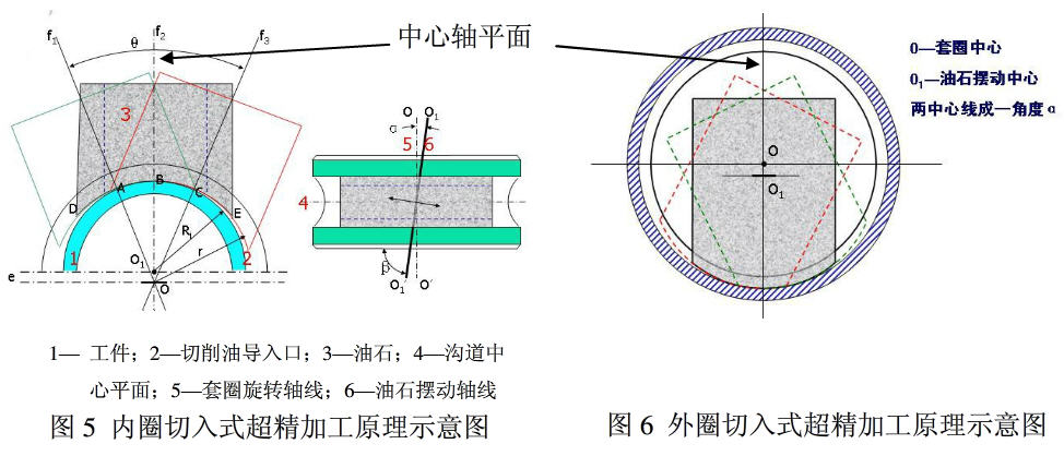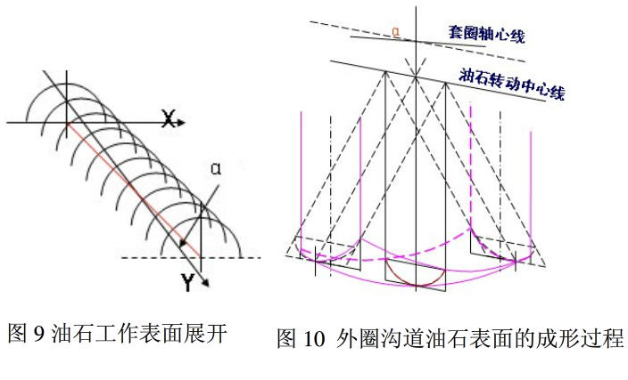 因此,仅在中心剖面上,沟道与油石之间的相对运动,存在着成圆的关系(尤如车床的车刀围绕中心摆动,零件自身回转一样)。