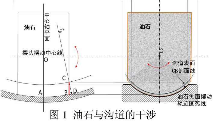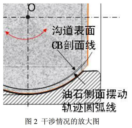 以外圈为例,如图1中的左图所示,油石绕摆头的摆动中心线摆动,CB是油石边侧的摆动面,端部截面应是圆弧线。油石有一定的宽度,沟道在CB位置上是平行于轴平面的剖面上的交线,是非圆弧线,因此油石会在沟道中受到限制而发生干涉(见图1的右图,详见放大的图2)。此时,不是油石研去套圈表面,就是套圈刮去油石。