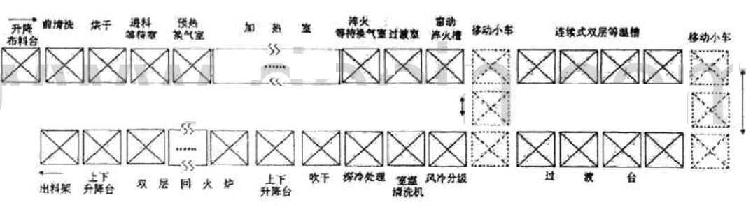 (1)生产线由可控气氛辊底式淬火加热炉、辊底式盐浴淬火槽、送料车、辊底式双层等温槽、辊底式清洗机、回火炉以及气氛、温度、程序控制系统构成。