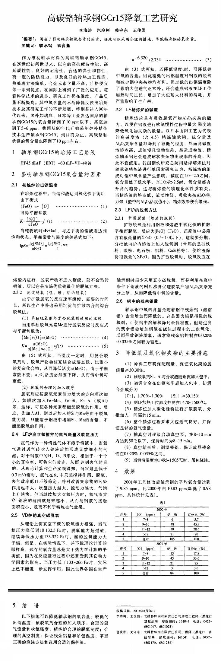 高碳铬轴承钢GCrl5降氧工艺研究
