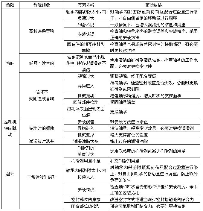 通过以上方法可确定出轴承在运行中是否处于正常状态以及应采取的措施,运转中轴承易出现的故障及预防措施见表2。
