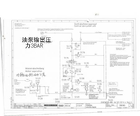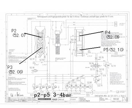 通过上面液压原理图纸可以明显看到整个X轴床身由4个压力点悬浮,V形导轨侧两个压力点P2、P3分别由减压阀52.07和减压阀52.08调节,平导轨有两个压力点P4、P5分别由减压阀52.09和减压阀52.10调节,正常压力要求为3―4bar,上述检查明显不符合图纸要求,对主泵和分油泵的输出压力进行调整,同时在机床4角打千分表验证,当52.07―52.10达到3bar时,图1 所显示的ABCD都能浮起0.004MM。