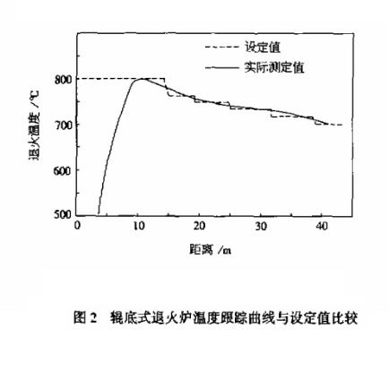 图2为800 ℃时退火温度跟踪曲线与设定值曲线的比较。从图2可见,虽然辊底炉退火工艺温度是分区设定的,且各区域之间都有20~30 ℃左右的温差,但从炉温跟踪曲线可以看出:实际炉温变化是连续的,即炉料的温度变化是连续而平缓的。每批钢材通过9个区后即完成了加热、保温、控制冷却这一普通球化退火过程。