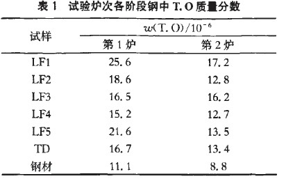 采用铝脱氧是目前使用Z广泛的脱氧方法,通过合适的造渣,在1550℃左右的精炼温度下,当钢中铝质量分数超过0.010%时,可使钢中溶解氧质量分数小于5 X10-6[1]。但铝脱氧产物是Al203,即使溶解氧很低,也并不意味着钢中总氧很低,而且Al203很容易聚集成团絮状大颗粒,危害钢的力学性能。因此,对于铝脱氧钢,精炼难点是如何去除钢中Al203夹杂物,从而降低钢中总氧量,试验炉次钢中T.O变化情况如表1。
