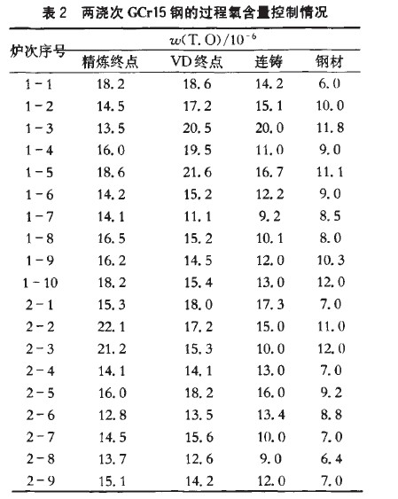 其中,1个浇次生产了10炉,随机抽取的为其中的第5炉,另1个浇次生产了9炉,随机抽取的为第6炉。国标GB/T18254—2002对GCrl5钢中氧质量分数的要求为连铸钢12x10-6,因此,所生产的两个浇次钢,均符合国标对钢中氧质量分数的要求,Z低为6.0x10-6。