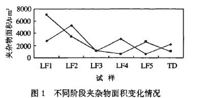 从图1可以看出,随着精炼过程的进行,夹杂物虽然受上浮和二次氧化等因素影响有略微的差异,但夹杂数量减少的趋势还是比较明显,钢中夹杂物面积总体趋势是逐步下降的。