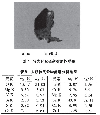 对所研究视场中较大颗粒夹杂物进行了形貌观察、能谱的成分分析。夹杂物中钙铝酸盐夹杂较多,另有氧化铝夹杂及多种成分的复合夹杂。因未对原材料中的钛进行控制,钢中发现了包裹氮化钛的大颗粒夹杂物,具体情况见图2和表5。