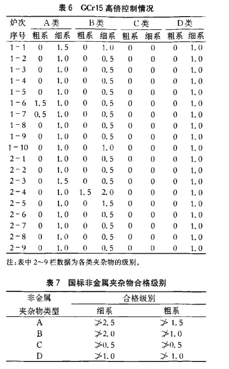 两个浇次的高倍检测情况,见表6。GB/T18254—2002对GCrl5钢中非金属夹杂物的要求,见表7。