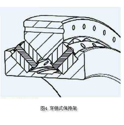 图4为金属一体的穿销式保持架。顾名思义,该轴承的滚动体为通孔式设计,在滚动体中间有一根销子分别连接在保持架侧圈的两端。在设计上,这种轴承的滚动体尺寸要比相同尺寸的其他轴承大得多,因为不仅要满足足够的承载能力,还要在滚动体内部开一个通孔以便穿销式保持架的安装。另外,滑动部件的润滑是一个很重要的问题,这在上文中已经提及。该轴承滚动体内孔与保持架穿销之间全部都是滑动摩擦,不仅润滑问题不好解决,它所带来的轴承发热也是必须要关注的问题。