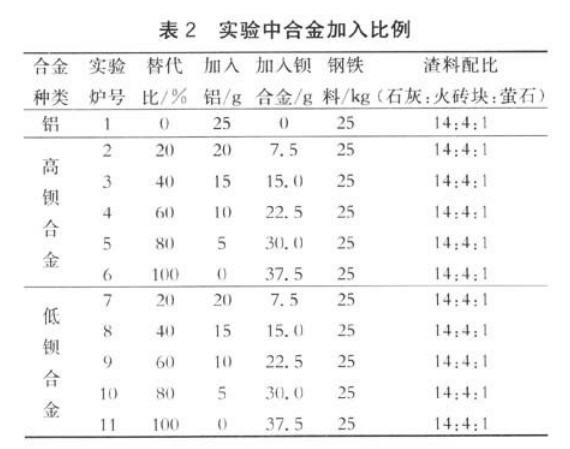 (1)实验是在ZG-0.025型25kg中频感应炉中进行,采用镁砂打结炉衬。渣料及合金料的烘烤在箱式退火炉中进行。