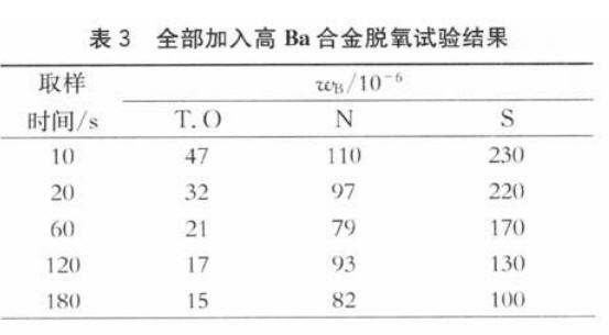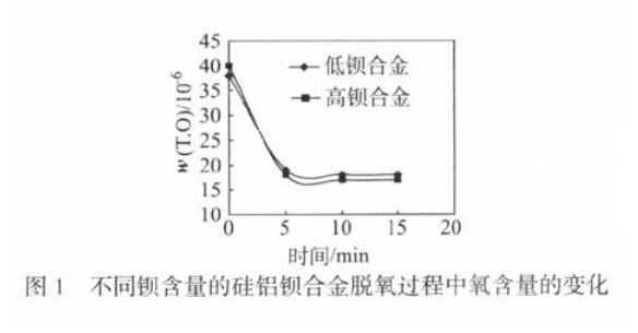 实验结果还显示,无论采用高钡合金还是低钡合金处理轴承钢,均可迅速将钢中全氧含量迅速降低到一稳定值(见图1)。
