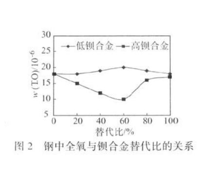 分别加入低钡合金和高钡合金时钢中全氧变化如图1所示,其结果相差不大。分析其原因主要在于采用轴承钢返回料和熔化过程中进行保护使钢液中初始氧含量较低,两者均可将钢中的氧降到较低水平,脱氧能力相差不大。但在氧含量较高的情况下,在保证铝预脱氧的基础上,高钡合金的脱氧作用就显得比较明显,由图2可见,当钡系合金替代比为40%~60%时,采用高钡合金可使钢中的氧含量明显低于低钡合金处理钢液。