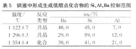 从表5可知,要生成液态夹杂需要较高的钡含量。钡含量对脱氧效果的影响研究发现[8],钡质量分数为6%的硅铝钡合金对夹杂物变性效果不明显,当钡质量分数达到12%~14%时,对夹杂物具有明显的变性效果,且夹杂物总量降低30%~40%。据此推断硅铝钡合金的钡含量越高,其对夹杂物的变性能力越强。当采用硅、铝预脱氧的情况下,再采用硅铝钡进行钢液深度脱氧和夹杂物变性时,钢中已有较多的硅、铝和Si02及A1203,此时对该合金的硅含量和铝含量可不作特殊要求,只需控制钡含量即可。因此,在采用硅、铝预脱氧的情况下,可使用含钡较高的硅钡合金对钢液进行深度脱氧和夹杂物变性,采用此种方法既可以降低脱氧成本,又可提高脱氧效果。