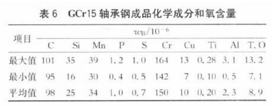 对于钡在钢中应用的理论与实验研究证明,钡的脱氧产物不会与A1203形成高熔点的铝尖晶石。在用钡合金处理的轴承钢中未发现含钡点状夹杂,且氧化物夹杂级别略低于铝终脱氧钢。对氧化物进行电解夹杂分析发现:钡合金处理钢中A1203占氧化物夹杂的比例小于45%,而铝处理钢中A1203占氧化物夹杂的比例大于60%。将钡合金处理和铝终脱氧2种工艺生产的钢进行疲劳寿命对比试验,在氧质量分数为8×10-6的情况下,采用铝处理时轴承钢疲劳寿命L10为6.854×106,采用钡合金处理时轴承钢疲劳寿命L10为1.121×107,钡合金处理钢的额定疲劳寿命比铝处理钢高63.55%。通过工艺优化,淮钢批量生产的36炉的钢材化学成分和钢中氧含量如表6。