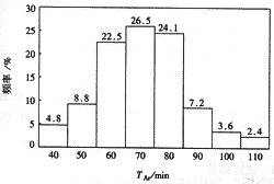 图1示出TAr分布状态。从图中可看出LFZ长吹氩加热时间为115min,Z短为40min,平均为73.6min,且近75%分布于60~90min。根据图1,确定LF吹氩加热时间为65~75 min。