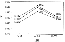 从回归方程(1)可看出入LF钢水温度、入VD钢水温度越高,越有利于降氧。