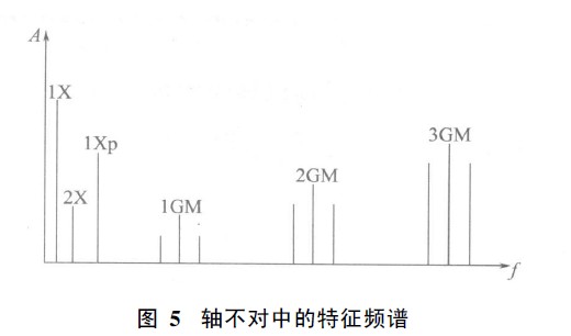 这时的振动信号将以齿轮啮合频率及其谐波为载波频率,齿轮所在轴转频及其倍频为调制频率;调制频率的2倍频幅值Z大;齿轮啮合频率及其谐波幅值增大;振动能量(有效值和峭度)有一定程度增大。特征频谱见图5。