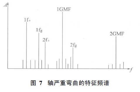 振动信号将以齿轮啮合频率及其谐波、齿轮固有频率、箱体固有频率为载波频率,此轮所在轴转频为调制频率的啮合频率调制,但边频带较宽,解调谱上出现轴的转频和多阶高次谐波;如果弯曲轴上有多对齿轮啮合,则会出现多对齿轮啮合调制;振动能量(有效值和峭度)有一定程度增加,特别是轴向振动能量有较大增加,特征频谱见图7。