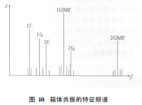 箱体共振:齿轮箱的一阶固有振动频率为主导地位,其他频率成分很低;振动能量有很大的增加。如果是箱体共振调制,以箱体、齿轮固有频率和齿轮啮合频率及其谐波为载波频率,故障齿轮或轴所在轴转频及其倍频为调制频率;齿轮啮合频率及其谐波幅值明显增大;特征频谱见图10。