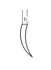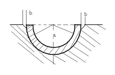 (3)润滑油楔。润滑油楔位于接触范围角a值之内油槽带与轴瓦的连接处,由手工刮削而成(俗称刮瓦口)。其主要作用有两个,一是存油冷却轴瓦与轴,二是利用其圆弧楔角,在轴旋转的带动下,将润滑油,由轴向宽度的面,连接不断地吸向承载部分,使轴瓦与轴有充分良好的润滑。润滑油楔部分是由两段不规则的圆弧组成的一个圆弧楔角,它将油槽带和轴瓦工作接触面光滑地连接起来,其形状如图3所示。与油槽带连接部分要刮得多一些,并将油槽带连接处加工棱角刮掉,在润滑楔角中部至接触面过渡处,刮成圆弧楔角形。图中b的尺寸为油槽带与润滑楔角连接处尺寸,视轴瓦的大小,一般在0.10~0.40mm之间。刮削润滑楔角,要在轴瓦精刮基本结束时进行,不易提前刮削。