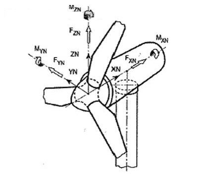 图1给出的是一个典型风力发电机上叶片受力图。在运行中,径向力主要来自重力,水平力主要来自风,转子的轴向力和倾覆力矩来自叶片。用来做分析比较的工况是由恒速16r/min下500多种不同受力情况合成的一个当量载荷工况。