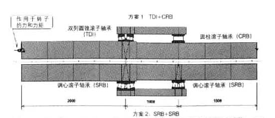 图2在中心线上给出了布置双列圆锥滚子轴承和圆柱滚子轴承的方案,中心线下是两个调心滚子轴承的方案。