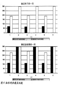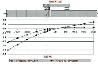 图3是主轴径向变形和位置的关系曲线,显示了装有预紧双列圆锥滚子轴承的主轴变形要比装有调心滚子轴承的小。这有两个原因:首先是和调心滚子轴承一直有径向游隙相比,双列圆锥滚子轴承有0.500的预紧,提高了系统的刚性。其次,双列圆锥滚子轴承改善了双列滚子之间的载荷分布,减小了每列的径向和轴向变形。